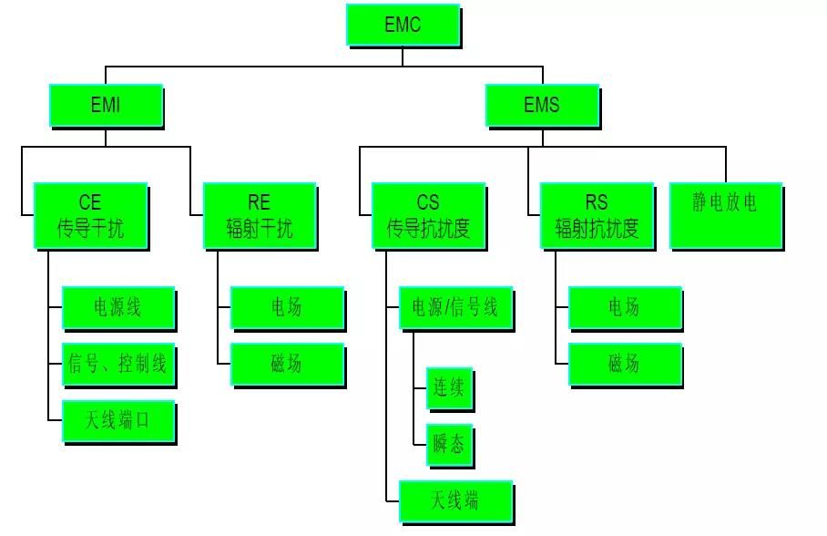 因此EMC按照傳播方式來(lái)又可以分為CE(傳導(dǎo)騷擾conduction emission)、RE(輻射騷擾radiation emission)、CS(傳導(dǎo)抗擾)、RS(輻射抗擾)四大類。