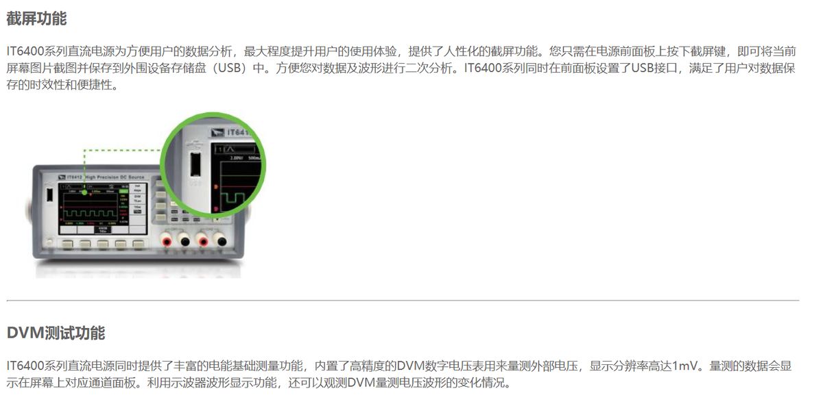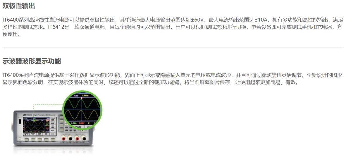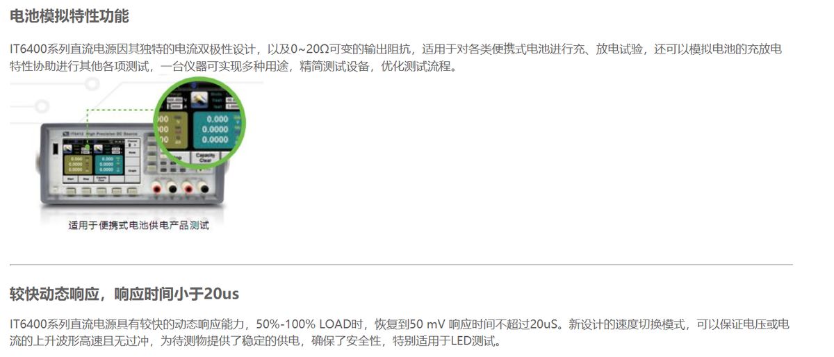 IT6400系列特有的雙極性電壓/電流輸出,可以用作雙極電源或雙極電子負(fù)載,其電池特性模擬功能尤其適用于便攜式電池供電產(chǎn)品的測試。高達(dá)1nA的解析度,小于20us的快速動態(tài)響應(yīng)時間,和新設(shè)計的速度切換模式可讓電壓或電流的上升波形高速且無過沖,上升時間快可達(dá)150us。同時,用戶還可以通過波形顯示功能實現(xiàn)示波器的體驗,讓使用更加簡易和有效。廣泛應(yīng)用于便攜式電池供電產(chǎn)品測試、移動電源測試、LED測試等領(lǐng)域。